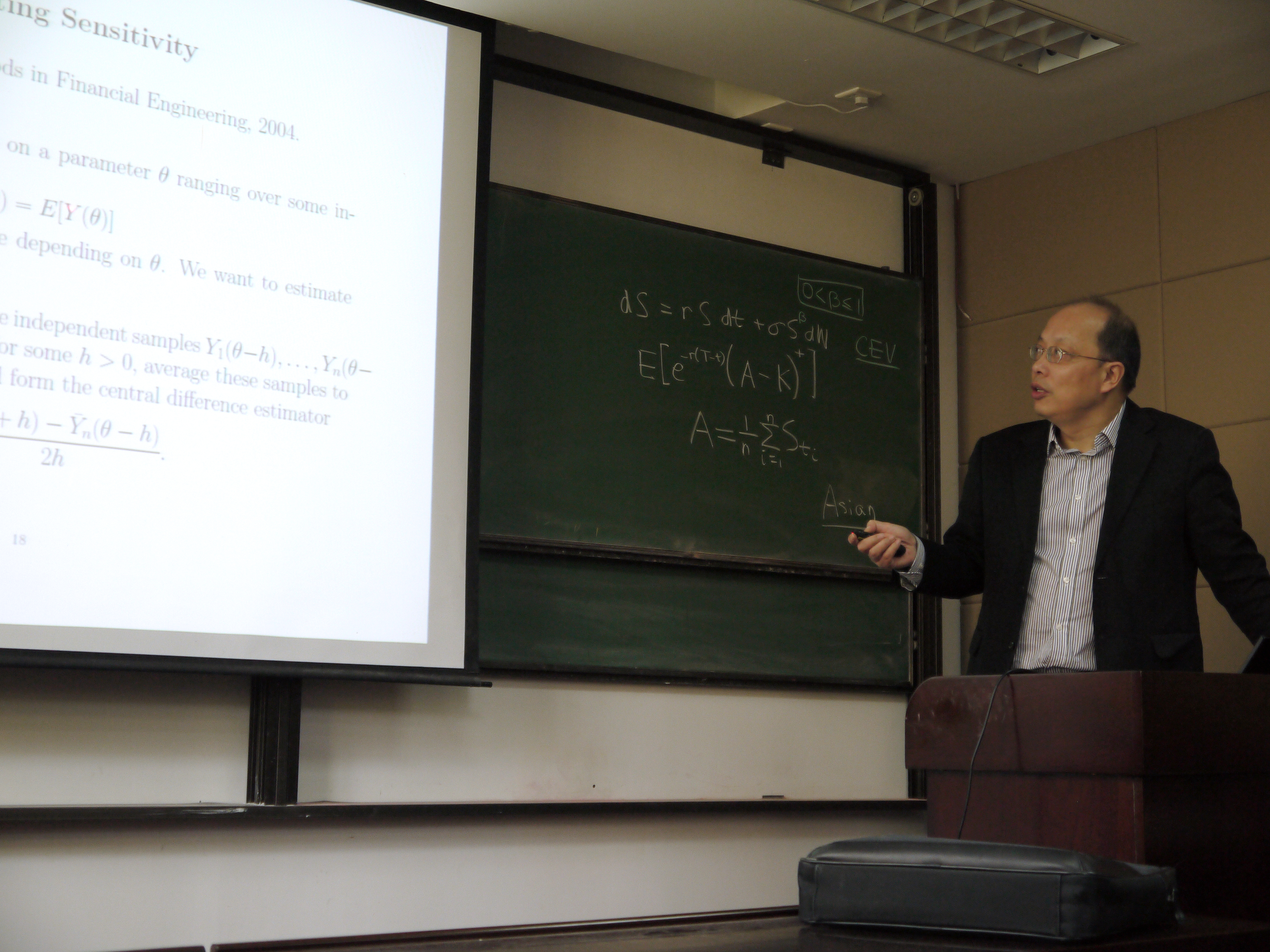 4月1日-4月3日,应金融工程研究中心的邀请,英国帝国理工大学(Imperial College, UK)Harry Zheng 教授访问中心,Harry Zheng 教授为中心师生作了题为“金融衍生产品定价中的随机模拟方法”的学术讲座。Harry Zheng 教授主要介绍了几类金融衍生产品定价的解析方法及定价中的随机模拟方法等。